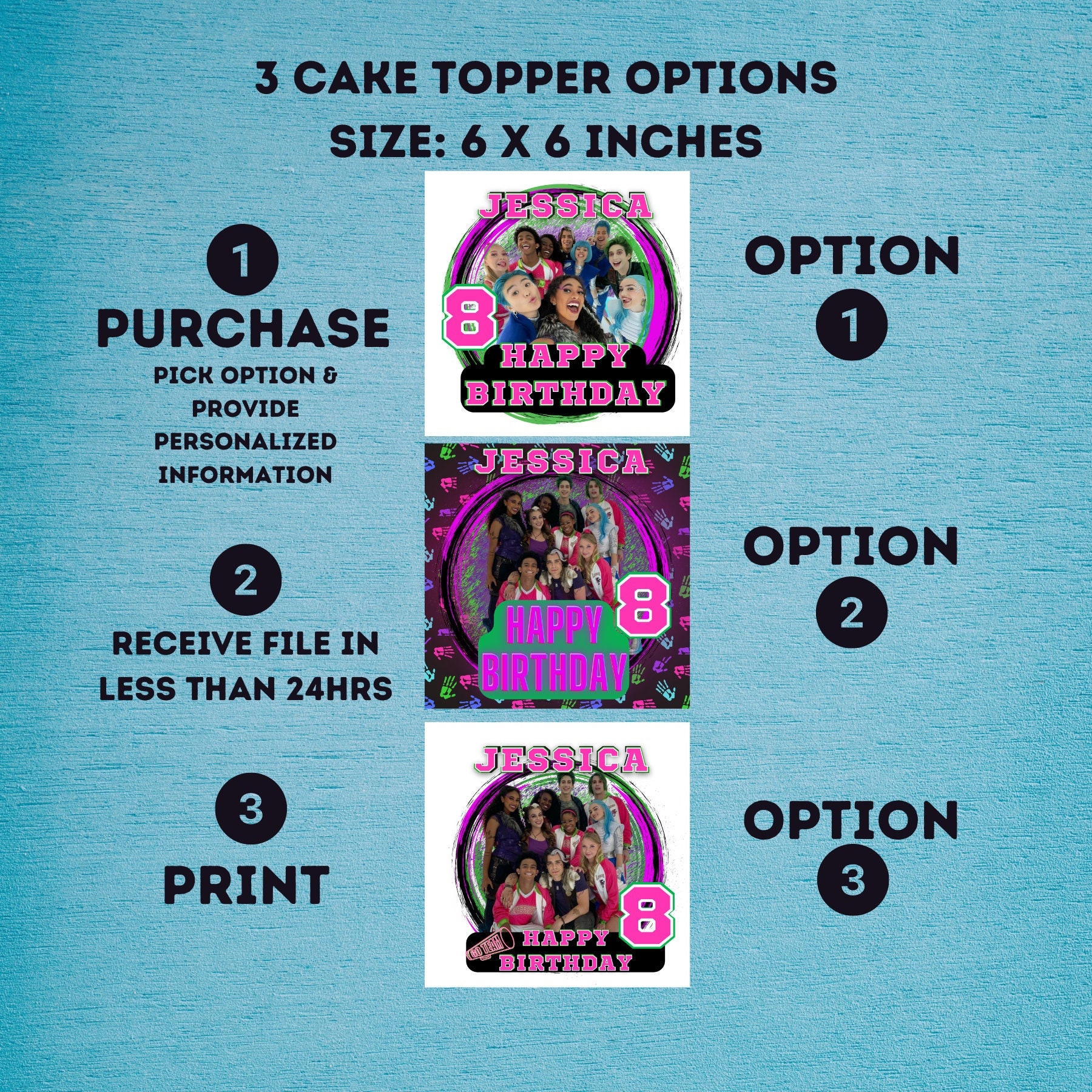 Select your Cake Toppers Option, provide personalized information, receive completed cake topper file in less than 24 hours!